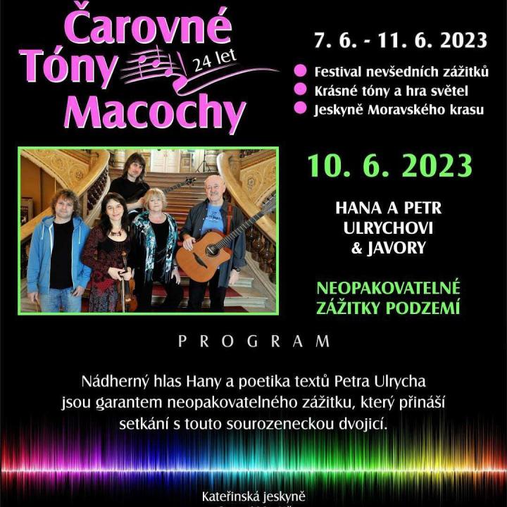 Nádherný hlas Hany Ulrychové a poetika textů jejího bratra Petra Ulrycha v recitálu s názvem Neopakovatelné zážitky - to přinesl večerní koncert 10. června 2023 v Kateřinské jeskyni. V programu v rámci cyklu Čarovné Tóny Macochy sourozeneckou dvojici tradičně doprovodila skupina Javory.